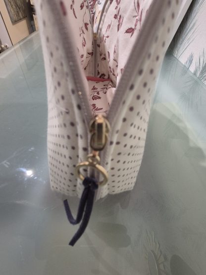 - Estampado de lunares malva sobre fondo blanco roto, que aporta un toque delicado y elegante.